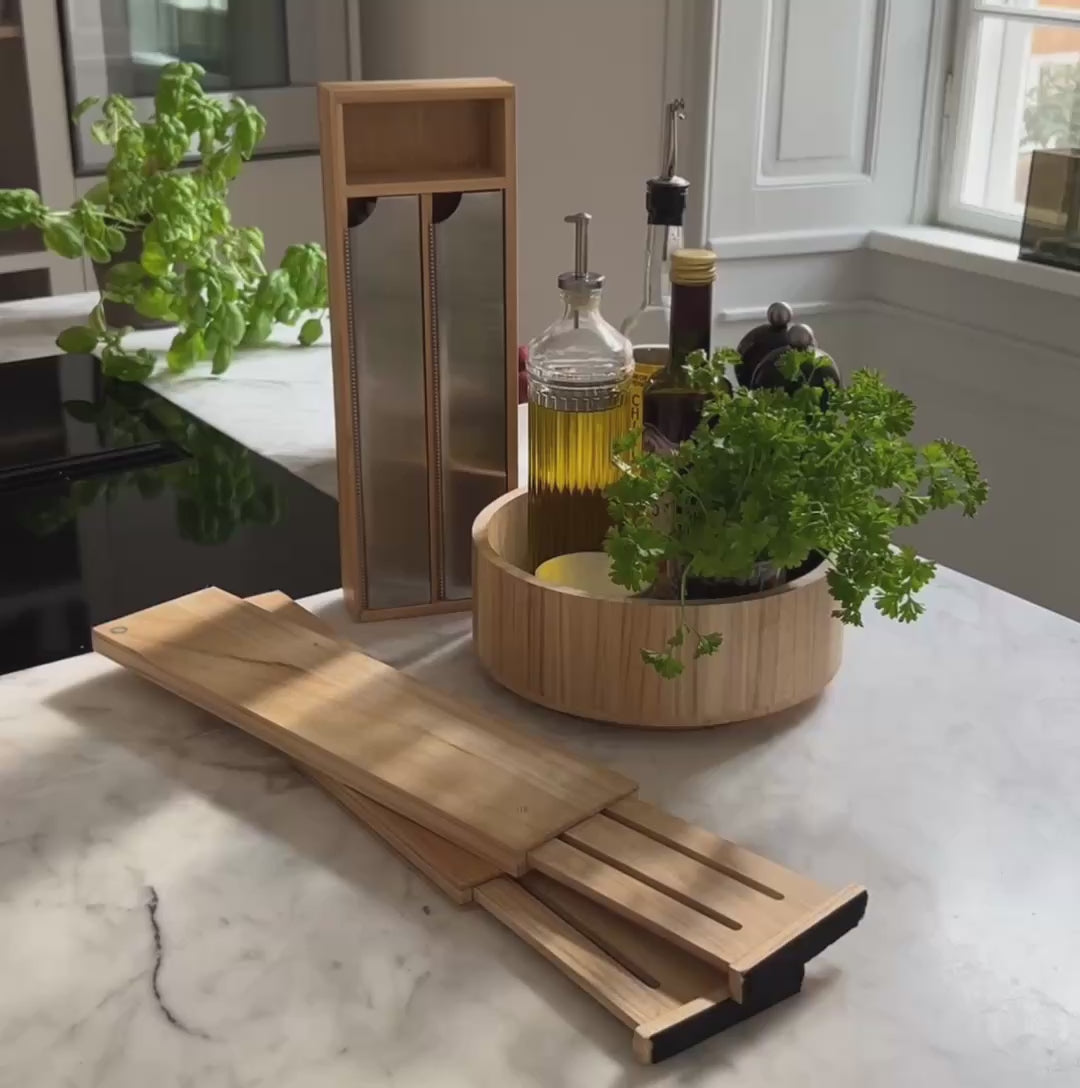 Unsere elegante Folienschale erleichtert die Aufbewahrung und Handhabung von Frischhaltefolie und Alufolie. Mit zwei Fächern mit passenden Einsätzen und einem kleineren Fach für Kleinteile wie Gummibänder und Klammern sorgt diese Bambus-Folienschale dafür, dass Ihre Küchenschubladen stets ordentlich und ästhetisch aussehen.