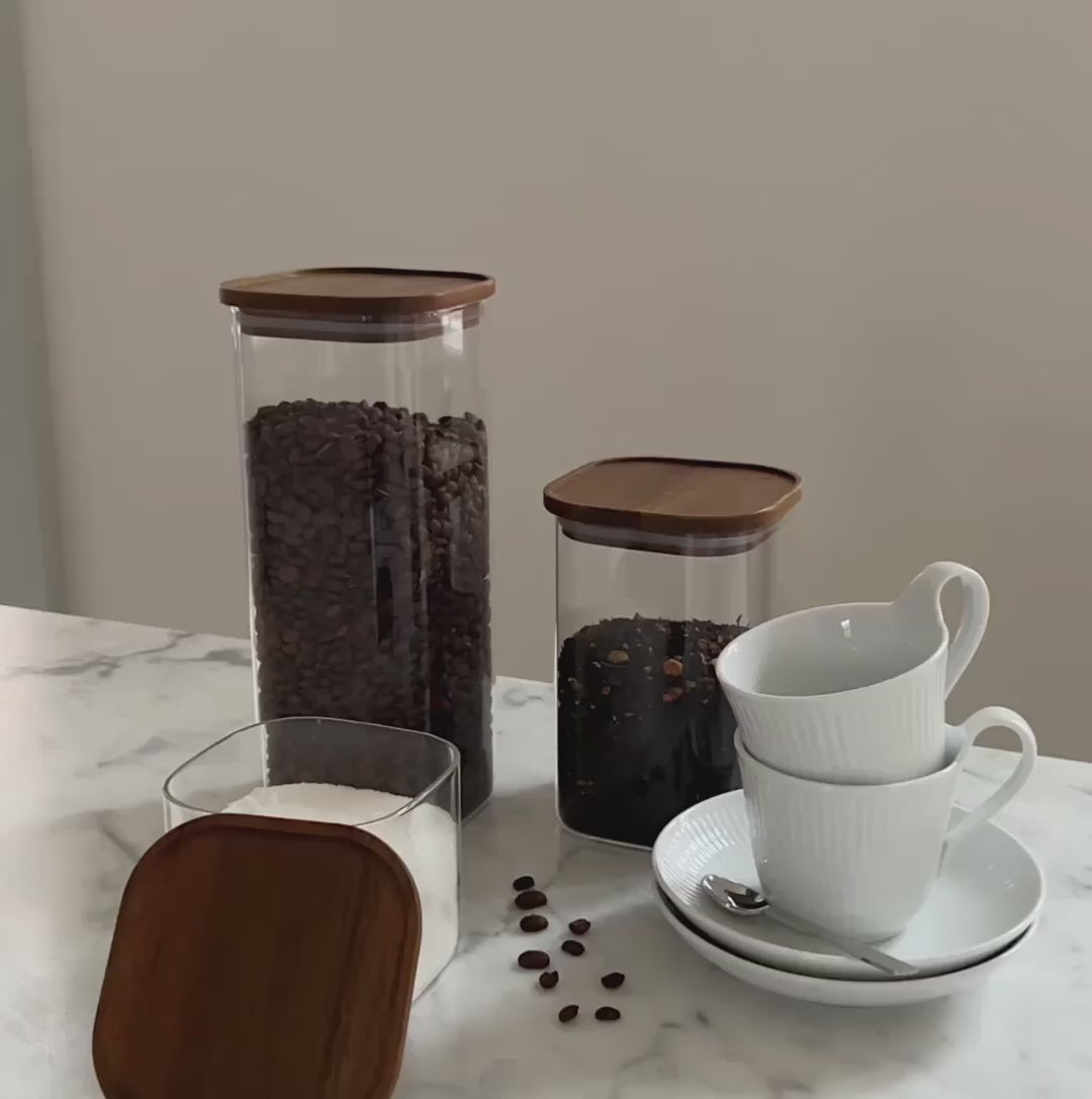 Die Gläser sind stapelbar, um den Platzbedarf zu optimieren. Das Glas gibt es in drei verschiedenen Größen und in zwei Farbvarianten. Eine Serie mit Deckeln aus hellem Paulownia-Holz und eine Serie mit Deckeln aus dunklem Akazienholz.